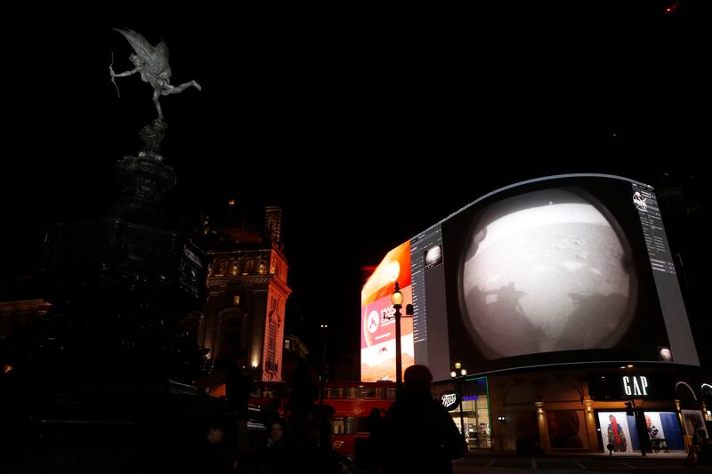 Photos: NASA rover Perseverance lands on Mars to look for signs of ancient life Images from Nasa are streamed live showing the landing of NASA's Perseverance on Mars, shown on Piccadilly Lights in central London, Thursday Feb. 18, 2021. The Mars rover landing mission begins it's search for traces of life after the successful landing, to explore and collect samples for future return to Earth. Eros statue top left. (AP Photo/Alastair Grant)
