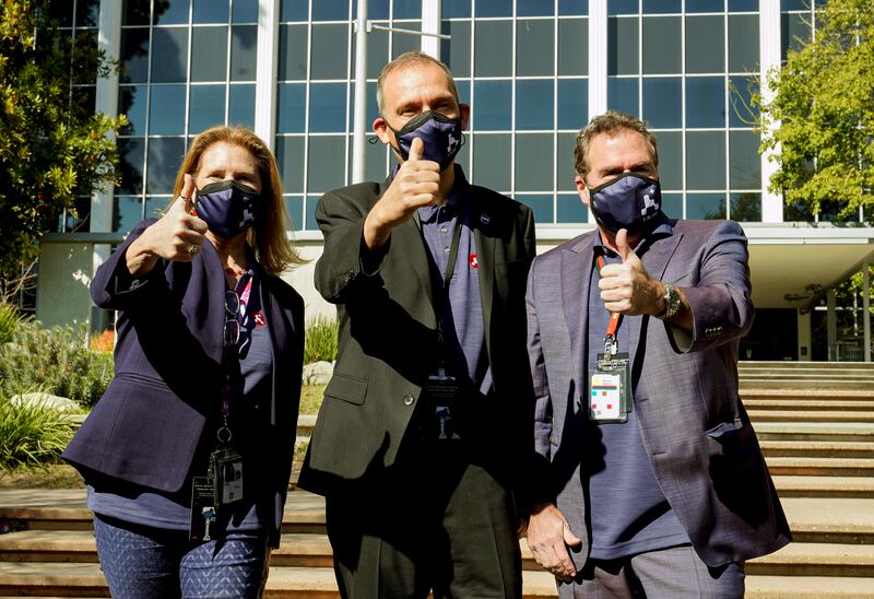 Photos: NASA rover Perseverance lands on Mars to look for signs of ancient life Lori Glaze, Director of NASA's Science Mission Directorate's Planetary Science Division, left, Thomas Zurbuchen, NASA Associate Administrator Science Mission Directorate, and Michael Watkins, Director of the Jet Propulsion Laboratory react after receiving confirmation the spacecraft successfully touched down on Mars, Thursday, Feb. 18, 2021, at NASA's Jet Propulsion Laboratory in Pasadena, Calif. (AP Photo/Damian Dovarganes)
