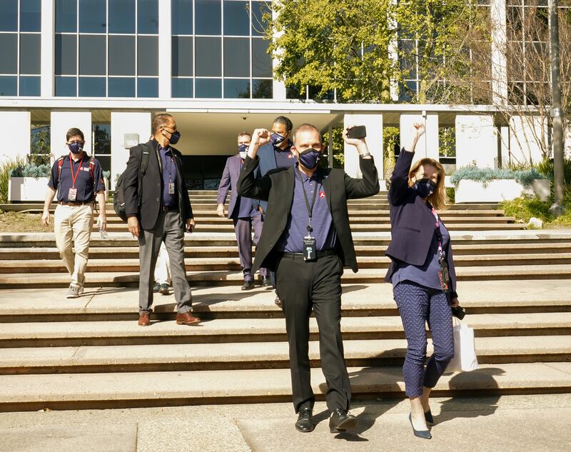 Photos: NASA rover Perseverance lands on Mars to look for signs of ancient life Thomas Zurbuchen, NASA Associate Administrator Science Mission Directorate, raises his arms, center, with Lori Glaze, Director of NASA's Science Mission Directorate's Planetary Science Division, right, as they walk with members of NASA's Perseverance rover team after receiving confirmation the spacecraft successfully touched down on Mars, Thursday, Feb. 18, 2021, at NASA's Jet Propulsion Laboratory in Pasadena, Calif. (AP Photo/Damian Dovarganes)