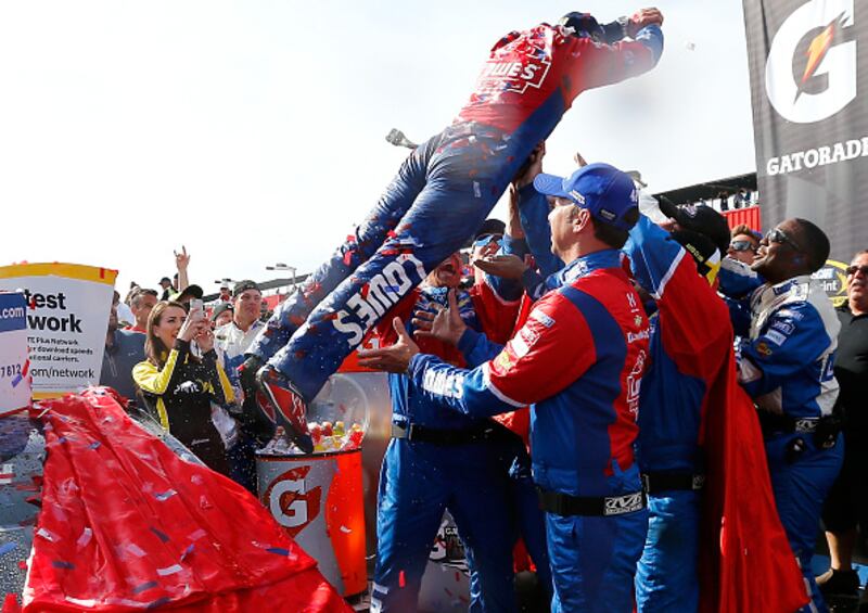 Through the years FONTANA, CA - MARCH 20: Jimmie Johnson, driver of the #48 Lowe's / Superman Chevrolet, dives into his crew members in victory lane after winning the NASCAR Sprint Cup Series Auto Club 400 at Auto Club Speedway on March 20, 2016 in Fontana, California. (Photo by Jonathan Ferrey/Getty Images) (Jonathan Ferrey/Getty Images)
