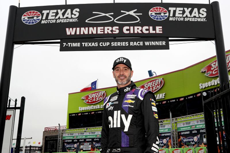 Through the years FORT WORTH, TEXAS - OCTOBER 25: Jimmie Johnson, driver of the #48 Ally designed by Noah Sweet Chevrolet, poses in front of the Texas Motor Speedway gate entering victory lane, renamed in his honor prior to the NASCAR Cup Series Autotrader EchoPark Automotive 500 at Texas Motor Speedway on October 25, 2020 in Fort Worth, Texas. (Photo by Chris Graythen/Getty Images) (Chris Graythen/Getty Images)