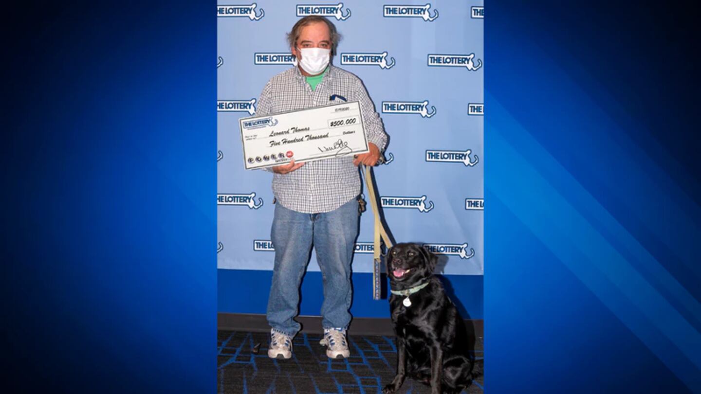 Thomas appeared at the Mass Lottery offices with his dog, Mariah, to get his larger-than-life check and collect his winnings Wednesday.