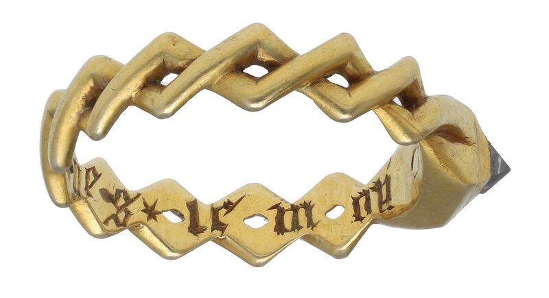 Accompanying the diamond, the gold ring has two intertwined bands that symbolize a union of a couple and is inscribed in medieval French, which translates to “I hold your faith, hold mine.”