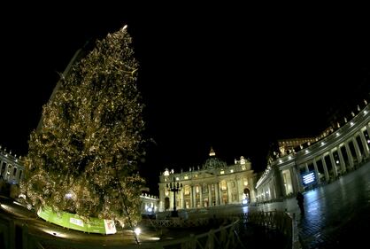 Photos: 2020 Vatican Christmas tree lighting brightens St. Peter's Square The new Christmas tree is lit during a ceremony in St. Peter's Square on December 11, 2020, in Vatican City, Vatican. (Alessandra Benedetti - Corbis/Corbis via Getty Images)