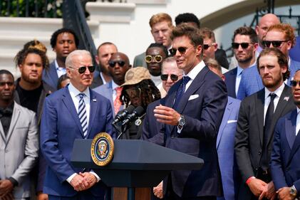 Photos: 2021 Super Bowl champs Tampa Bay Buccaneers visit White House President Joe Biden, surrounded by members of the Tampa Bay Buccaneers, listens as Tampa Bay Buccaneers quarterback Tom Brady speaks during a ceremony on the South Lawn of the White House, in Washington, Tuesday, July 20, 2021, where Biden honored the Super Bowl Champion Tampa Bay Buccaneers for their Super Bowl LV victory. (AP Photo/Manuel Balce Ceneta) (Manuel Balce Ceneta/AP)