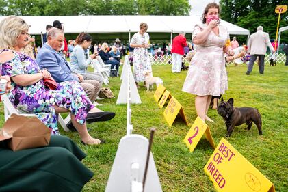 2021 Westminster Dog Show A handler adjusts her face mask while a limited number of spectators watch the French bulldog breed judging at the 145th Annual Westminster Kennel Club Dog Show, Saturday, June 12, 2021, in Tarrytown, N.Y. (AP Photo/John Minchillo) (John Minchillo/AP)