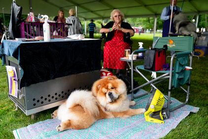 2021 Westminster Dog Show Quinn, a chow chow, who won the top prize in his breed group, rests in front of a fan after judging at the 145th Annual Westminster Kennel Club Dog Show, Saturday, June 12, 2021, in Tarrytown, N.Y. (AP Photo/John Minchillo) (John Minchillo/AP)