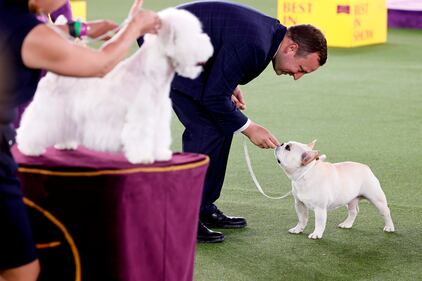 2021 Westminster Dog Show Captain, a French bulldog, is pet by his handler while participating in breed judging at the 145th Annual Westminster Kennel Club Dog Show, Saturday, June 12, 2021, in Tarrytown, N.Y. (AP Photo/John Minchillo) (John Minchillo/AP)