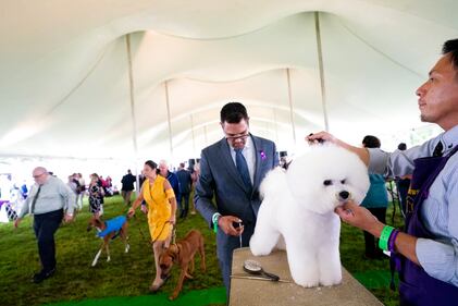 2021 Westminster Dog Show A bichon frise is groomed in the staging area in the tented judging area at the 145th Annual Westminster Kennel Club Dog Show, Saturday, June 12, 2021, in Tarrytown, N.Y. (AP Photo/John Minchillo) (John Minchillo/AP)