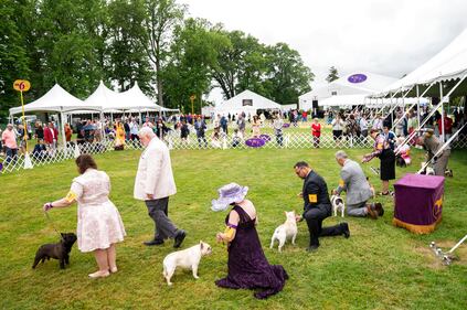2021 Westminster Dog Show Captain, a French bulldog, second from left, participates in breed judging at the 145th Annual Westminster Kennel Club Dog Show, Saturday, June 12, 2021, in Tarrytown, N.Y. (AP Photo/John Minchillo) (John Minchillo/AP)