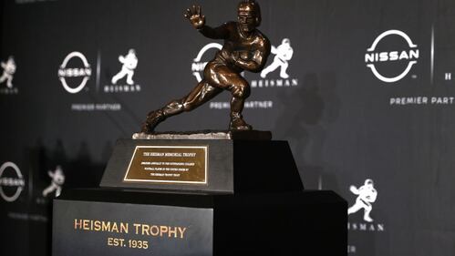 2022 Heisman Trophy Presentation NEW YORK, NEW YORK - DECEMBER 10: A general view of the Heisman Trophy is seen during a press conference prior to the 2022 Heisman Trophy Presentation at New York Marriott Marquis Hotel on December 10, 2022 in New York City. (Photo by Sarah Stier/Getty Images) (Sarah Stier/Getty Images)