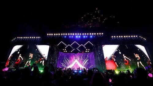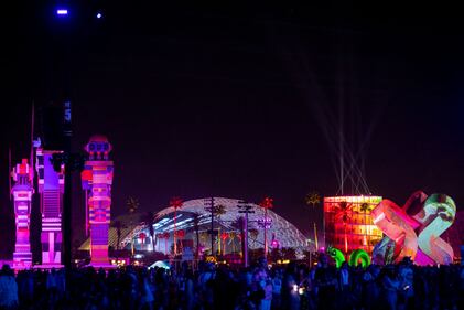 2023 Coachella Music And Arts Festival, Weekend 1, Day 2 INDIO, CALIFORNIA - APRIL 15: A view of the night skyline at the 2023 Coachella Valley Music And Arts Festival on April 15, 2023 in Indio, California. (Photo by Emma McIntyre/Getty Images for Coachella) (Emma McIntyre/Getty Images for Coachella)