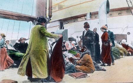 Titanic On board the RMS Carpathia, the castaways of the RMS Titanic are supplied with blankets to keep warm. (Photo by: Carl Simon/United Archives/Universal Images Group via Getty Images) (United Archives/Archiv Carl Simon/Universal Images Group via Getty)