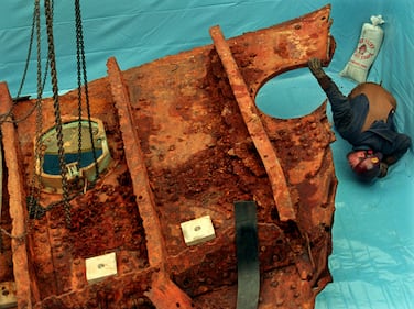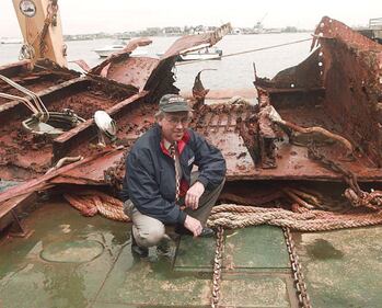 Titanic Allan Carlin, general counsel for RMS Titanic Inc., poses for photographers in front of a section of the hull of the RMS Titanic at the Commonwealth Pier in Boston, 21 August. The 20-ton steel piece, which was recovered 10 August from the floor of the Atlantic off Newfoundland 10 miles from the original wreck site, will join the Titanic exhibition underway at the World Trade Center in Boston. (Photo credit: STUART CAHILL/AFP via Getty Images) (AFP/AFP via Getty Images)