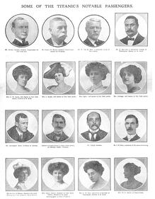 Titanic Some of the Titanic's Notable Passengers', April 20, 1912. Photographs of well-to-do passengers, some 'known to be saved'. The White Star Line ship RMS 'Titanic' struck an iceberg in thick fog off Newfoundland on 14 April 1912. She was the largest and most luxurious ocean liner of her time, and thought to be unsinkable. In the collision, five of her watertight compartments were compromised and she sank. Out of the 2228 people on board, only 705 survived. A major cause of the loss of life was the insufficient number of lifeboats she carried. Page 5, from "Titanic In Memoriam Number", a special supplement in "The Daily Graphic" newspaper issued following the sinking of the 'Titanic' on 15 April 1912, published on 20 April 1912. Artist Unknown. (Photo by The Print Collector/Getty Images) (Print Collector/Getty Images)