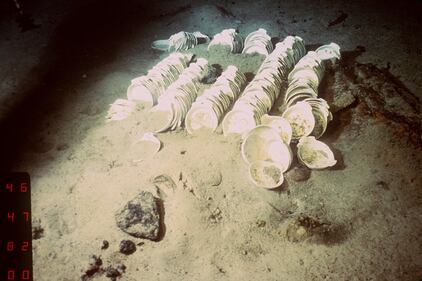 Titanic Sets of breakfast dishes from the sunken Titanic (1912) are shown in New York, 25 August 1987, in the position they were found by expedition Titanic 1987. (Photo by - / AFP) (Photo credit should read -/AFP via Getty Images) (-/AFP via Getty Images)