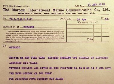 Titanic A telegraph message from a ship called Olympic reports that it has received word from the Titanic that it has stuck an iceberg. The message is one of several similar messages from ships in the vicinity of the Titanic detailing the events leading up to it's sinking which were on display 13 February at Christie's East in New York City and will be auctioned as part of a Maritime auction on 17 February. AFP PHOTO Matt CAMPBELL (Photo credit: MATT CAMPBELL/AFP via Getty Images) (MATT CAMPBELL/AFP via Getty Images)