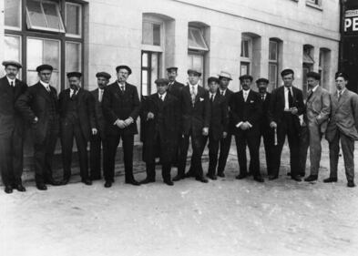 Titanic 29th April 1912: Stewards who survived the Titanic shipwreck line up outside a first class waiting room before being called in for questioning by the board of enquiry. (Photo by Topical Press Agency/Getty Images) (Topical Press Agency/Getty Images)