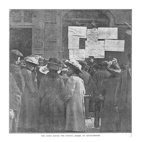 Titanic The Scene Round the Fateful Board at Southampton', April 20, 1912. Anxious relatives and friends wait for news after the disaster. The White Star Line ship RMS 'Titanic' struck an iceberg in thick fog off Newfoundland on 14 April 1912. She was the largest and most luxurious ocean liner of her time, and thought to be unsinkable. In the collision, five of her watertight compartments were compromised and she sank. Out of the 2228 people on board, only 705 survived. A major cause of the loss of life was the insufficient number of lifeboats she carried. Page 20, from "Titanic In Memoriam Number", a special supplement in "The Daily Graphic" newspaper issued following the sinking of the 'Titanic' on 15 April 1912, published on 20 April 1912. Artist Unknown. (Photo by The Print Collector/Getty Images) (Print Collector/Getty Images)