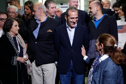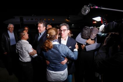 Return to the U.S. Family members greet freed Americans Siamak Namazi, Morad Tahbaz and Emad Shargi, as well as two returnees whose names have not yet been released by the U.S. government, who were released in a prisoner swap deal between U.S and Iran, as they arrive at Davison Army Airfield, Tuesday, Sept. 19, 2923 at Fort Belvoir, Va. (Jonathan Ernst/Pool via AP) (Jonathan Ernst/AP)
