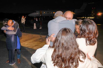 Return to the U.S. Family members embrace freed American Siamak Namazi after he and four fellow detainees were released in a prisoner swap deal and arrive at Davison Army Airfield, Tuesday, Sept. 19, 2003 at Fort Belvoir, Va. (Jonathan Ernst/Pool via AP) (Jonathan Ernst/AP)