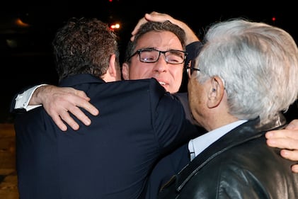 Return to the U.S. A family member embraces freed American Siamak Namazi after he and four fellow detainees were released in a prisoner swap deal and arrive at Davison Army Airfield, Tuesday, Sept. 19, 2003 at Fort Belvoir, Va. (Jonathan Ernst/Pool via AP) (Jonathan Ernst/AP)