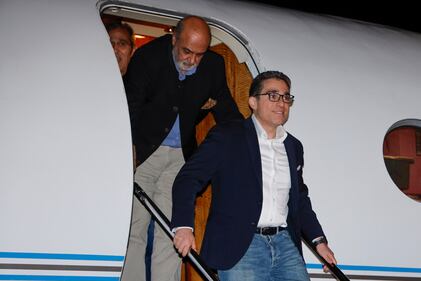 Return to the U.S. Emad Sharghi, Morad Tahbaz and Siamak Namazi, former prisoners in Iran, walk out of a Qatar Airways flight that brought them out of Tehran and to Doha, Qatar, Monday, Sept. 18, 2023. Five prisoners sought by the U.S. in a swap with Iran were freed Monday and headed home as part of a deal that saw nearly $6 billion in Iranian assets unfrozen. (AP Photo/Lujain Jo) (Lujain Jo/AP)