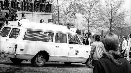 Kent State shootings: An ambulance leaves the campus of Kent State University after the Ohio National Guard opened fire, killing four students and wounding nine others. (Howard Ruffner/Getty images )