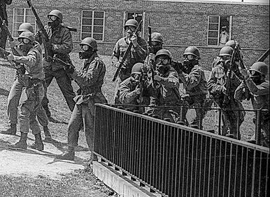 Kent State shootings: View of Ohio National Guardsmen in gas masks as they aim their weapons on the Kent State University campus during student antiwar protests. (Howard Ruffner/Getty Images)