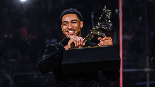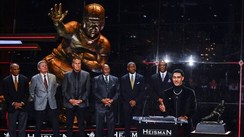 87th Heisman Trophy Ceremony Alabama quarterback Bryce Young speaks after winning the Heisman Trophy at the award ceremony Saturday, Dec. 11, 2021, in New York. (Todd Van Emst/Heisman Trust via AP, Pool)