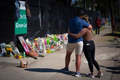 Astroworld aftermath Two people who knew an unidentified victim of a fatal incident at the Houston Astroworld concert embrace at a memorial on Sunday, Nov. 7, 2021. (AP Photo/Robert Bumsted) (Robert Bumsted/AP)