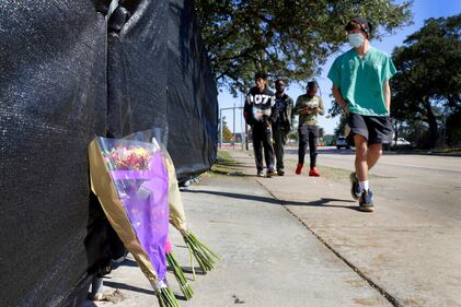 Astroworld aftermath Flowers lie against the south fence surrounding the Astroworld festival grounds as festival attendants, from left, Andrew Diaz, Brandon Beauval, Joshua Robinson and Billy Nasser walk by the day after several people died and scores were injured during a concert the night before at NRG Park, Saturday, Nov. 6, 2021, in Houston. (AP Photo/Michael Wyke) (Michael Wyke/AP)