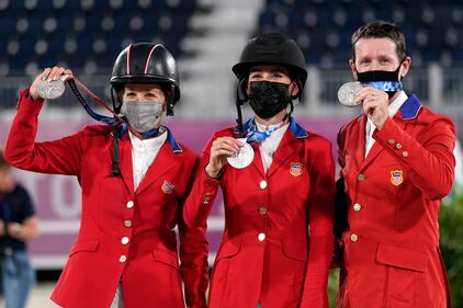 Photos: Bruce Springsteen's daughter Jessica wins Olympic silver in equestrian team jumping United States' Laura Kraut, left, Jessica Springsteen and McLain Ward, right, display their silver medals in the equestrian jumping team final at Equestrian Park in Tokyo at the 2020 Summer Olympics, Saturday, Aug. 7, 2021, in Tokyo, Japan. (AP Photo/Carolyn Kaster)