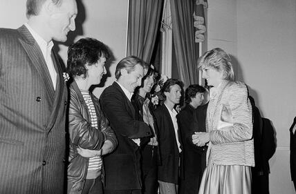 1983 Diana, Princess of Wales (1961 -1997) meets Rolling Stones drummer Charlie Watts and guitarist Bill Wyman after a rock concert at the Albert Hall, London, 22nd September 1983; also Steve Winwood and Eric Clapton. The princess is wearing a total silver outfit. (Photo by Terry Disney/Daily Express/Hulton Archive/Getty Images) (Terry Disney/Getty Images)