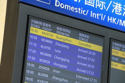 Photos: China Eastern flight carrying 132 people crashes in Guangxi A flight information board shows a cancelled China Eastern Airlines flight (top) at the Kunming Changshui International Airport in China's southwestern Yunnan province on March 21, 2022, after a China Eastern aircraft flying from Kunming to the southern hub of Guangzhou crashed in southwestern China. (STR/AFP via Getty Images)