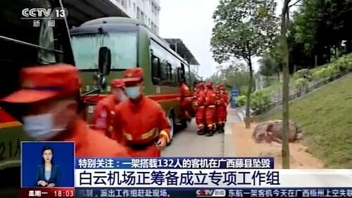 Photos: China Eastern flight carrying 132 people crashes in Guangxi In this image taken from video footage run by China's CCTV, emergency personnel prepare to travel to the site of a plane crash near Wuzhou in southwestern China's Guangxi Zhuang Autonomous Region, Monday, March 21, 2022. (CCTV via AP)