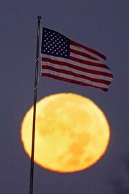 Photos: Halloween Blue Moon brightens the night sky The full blue moon sets beyond an American flag Saturday, Oct. 31, 2020, in Kansas City, Mo. (AP Photo/Charlie Riedel)