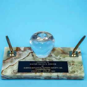 History for sale in NYC auction Marble base Pen set. This was a gift from the Queens Botanical Garden Society 1990 in honor of Arbor day. (NYC DCAS)