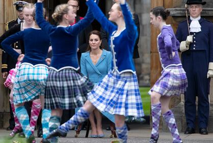 Photos: Kate Middleton, Prince William wrap up Scottish tour with tennis, closing ceremony Catherine, Duchess of Cambridge, meets Highland dancers during a Beating of the Retreat at the Palace of Holyroodhouse on May 27, 2021, in Edinburgh, Scotland. (Jane Barlow-WPA Pool/Getty Images)