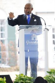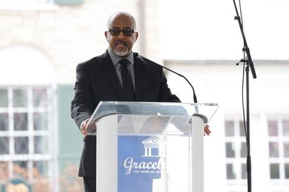 Lisa Marie Presley memorial service: Former Memphis Mayor A.C. Wharton speaks onstage at the public memorial for Lisa Marie Presley at Graceland. (Jason Kempin/Getty Images)