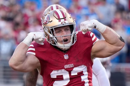 NFC Championship: Christian McCaffrey celebrates after scoring a touchdown during the second quarter against the Detroit Lions. (Thearon W. Henderson/Getty Images)