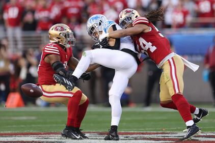 NFC Championship: San Francisco's Fred Warner (54) breaks up a pass intended for Detroit's Amon-Ra St. Brown. (Ezra Shaw/Getty Images)