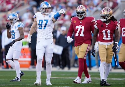NFC Championship: Detroit's Aidan Hutchinson (97) makes a point during first-half action. (Thearon W. Henderson/Getty Images)