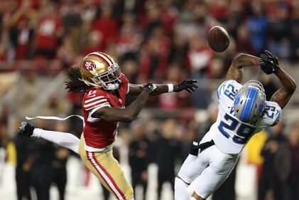 NFC Championship: Kindle Vildor (29) of the Detroit Lions attempts to intercept a pass intended for Brandon Aiyuk (11) of the 49ers during the third quarter. (Ezra Shaw/Getty Images)