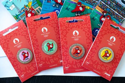 Olympic mascots unveiled PARIS, FRANCE - NOVEMBER 10: A close-up at pins representing The Phryges, modelled on phrygian caps as the mascots for the Paris 2024 Summer Olympic and Paralympic Games on November 10, 2022 in Paris, France. (Photo by Marc Piasecki/Getty Images) (Marc Piasecki/Getty Images/Getty Images)