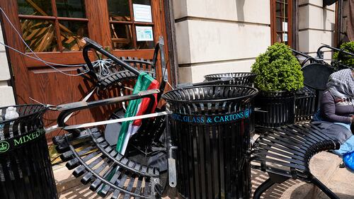 Police arrest nearly 300 in protests at Columbia University, CCNY Benches and trash bins block the entrance to Hamilton Hall where some student protesters camped on the campus of Columbia University on April 30, 2024 in New York City. All classes at Columbia University have been held virtually today after school President Minouche Shafik announced a shift to online learning in response to recent campus unrest. (Pool/Getty Images)