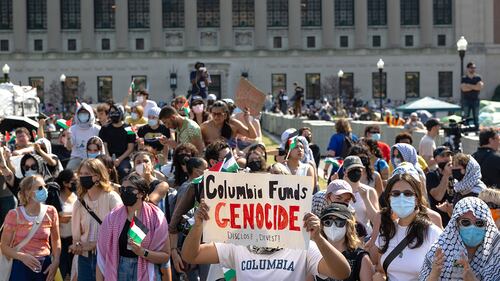 Police arrest nearly 300 in protests at Columbia University, CCNY Pro-Palestinian demonstrators hold a short rally after marching around the "Gaza Solidarity Encampment" in the West Lawn of Columbia University on April 29, 2024 in New York City. Demonstrators marched at Columbia University as a 2 P.M. deadline to clear the encampment given to students by the university passed. Columbia was the first elite college to erect an encampment in support of Palestine, with students demanding that the school divest from Israel amid the Israel-Hamas war, in which more than 34,000 Palestinians have been killed in the Gaza Strip. (Michael M. Santiago/Getty Images)