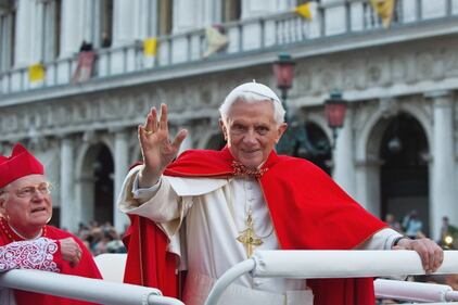Through the years VENICE, ITALY - MAY 07: Pope Benedict XVI greets the crowd gathered in St Mark's Square while crossing the square on an electric car on May 7, 2011 in Venice, Italy. Pope Benedict XVI is visiting Venice until May 8, some 26 years after his predecessor Pope John Paul II last visited the city. (Photo by Marco Secchi/Getty Images) (Marco Secchi/Getty Images)