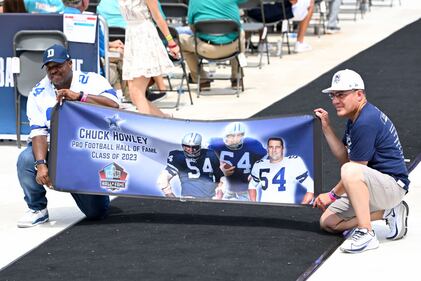 Pro Football Hall of Fame: Dallas Cowboys fans pose for a photo with a banner celebrating Chuck Howley's enshrinement into the Pro Football Hall of Fame. (Nick Cammett/Getty Images)