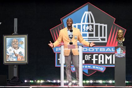 Pro Football Hall of Fame: DeMarcus Ware speaks during the 2023 Pro Football Hall of Fame enshrinement ceremony on Saturday. (Nick Cammett/Getty Images)